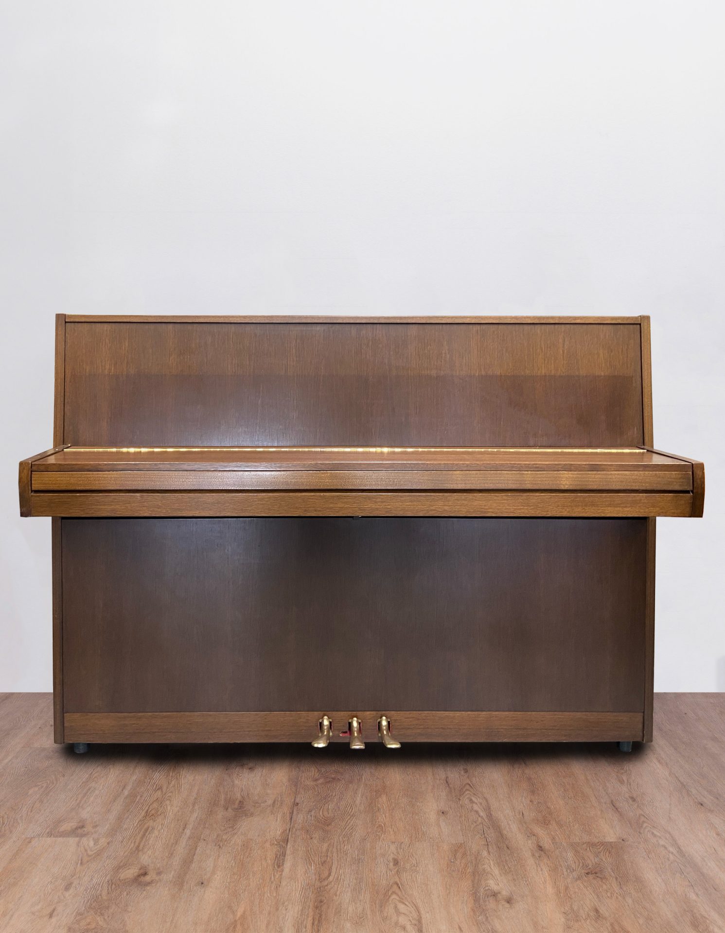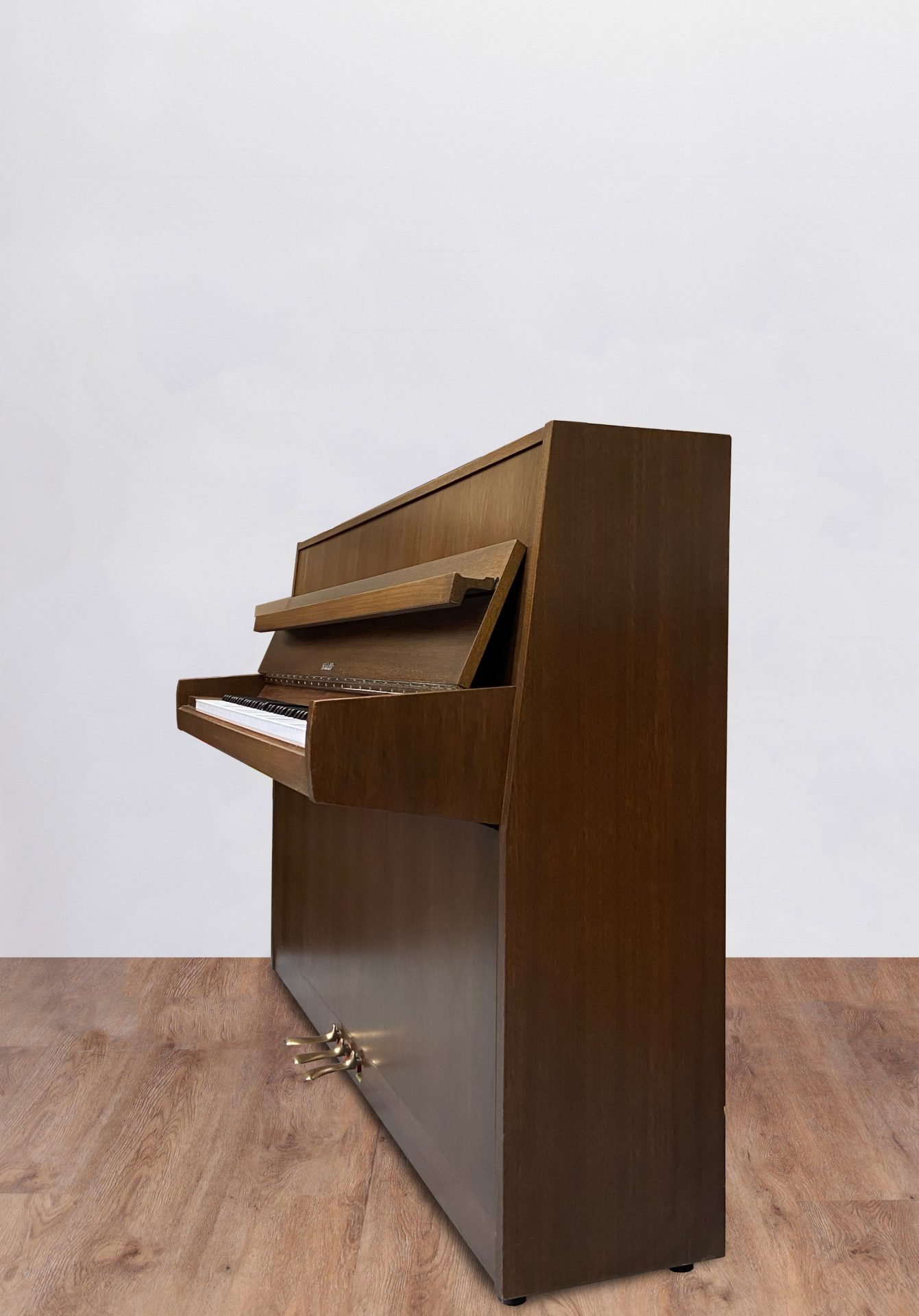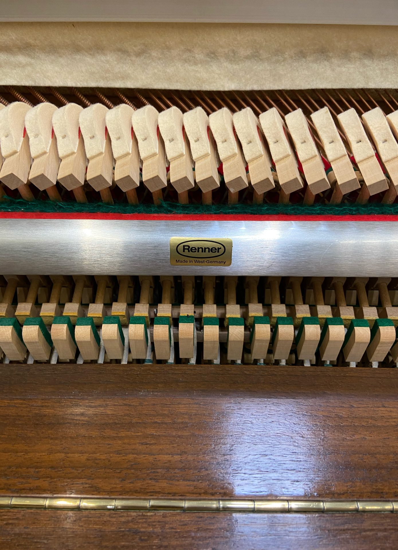 On le sait peu, mais les finlandais ont été eux aussi des producteurs d’excellents pianos, notamment à travers la marque hellas (également déclinée sous l’estampille sinding, et qui racheta en 1989 l’usine fazer), proposant alors une gamme restreinte – six ou sept modèles – dont le plus répandu fut le modèle orfeo. ce piano-ci, rare et singulier, se distingue par une qualité tout à fait exceptionnelle : il est équipé d’une mécanique renner, référence absolue de la facture allemande, prisée pour sa longévité, sa précision millimétrée et son comportement irréprochable dans le temps. le toucher y est simplement remarquable : fluide, rapide, précis, nerveux sans être sec, avec un retour immédiat et constant qui permet une grande liberté d’expression et un contrôle sans faille, même dans les passages les plus virtuoses. cette réactivité, alliée à une sonorité claire et limpide, donne à l’instrument une vraie personnalité, idéale pour l’étude sérieuse comme pour le plaisir raffiné de jouer.bien conservé et peu sollicité au fil des ans – l’état quasi neuf des feutres de marteaux en témoigne –